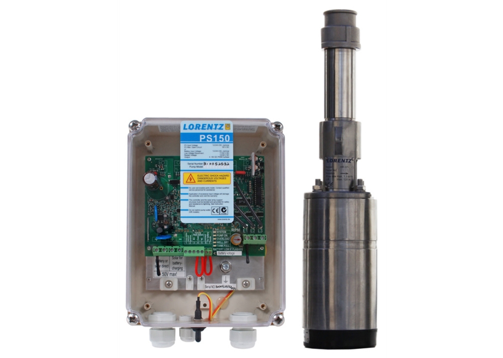 The Lorentz PS 150 HR-04S Solar Submersible Pump is a high specifications solar powered helical DC pump specifically designed for reliable small-scale water supply from boreholes and wells and is the ideal solution for remote pumping requirements in livestock watering, irrigation and general water supply applications. Pumps feature a remote surface mounted controller and are constructed principally from AISI 304/316 stainless steel and they are engineered to the highest standards to give easy serviceability, excellent efficiency, high reliability and long life.