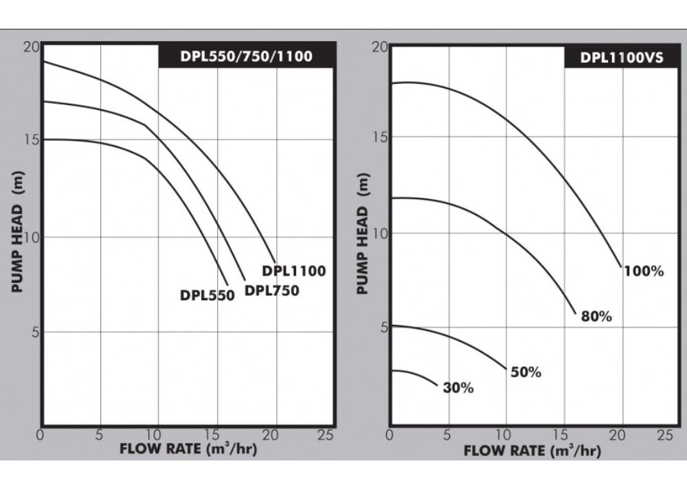 DPL 1100 VS Variable Speed - Asynchronous motor fitted with an inbuilt frequency converter to provide three preset operating speeds at 100%, 80% and 50% of maximum as well a fractional speed adjustment facility down to 30%. Intelligent protection from overvoltage, under voltage, overload and short circuit is also provided for extended motor life. The motor is also suitable for 50&60Hz frequency supply.